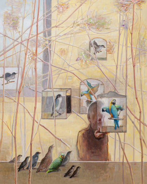 L’homme et des oiseaux,2024,huile sur toile,162 x 130cm